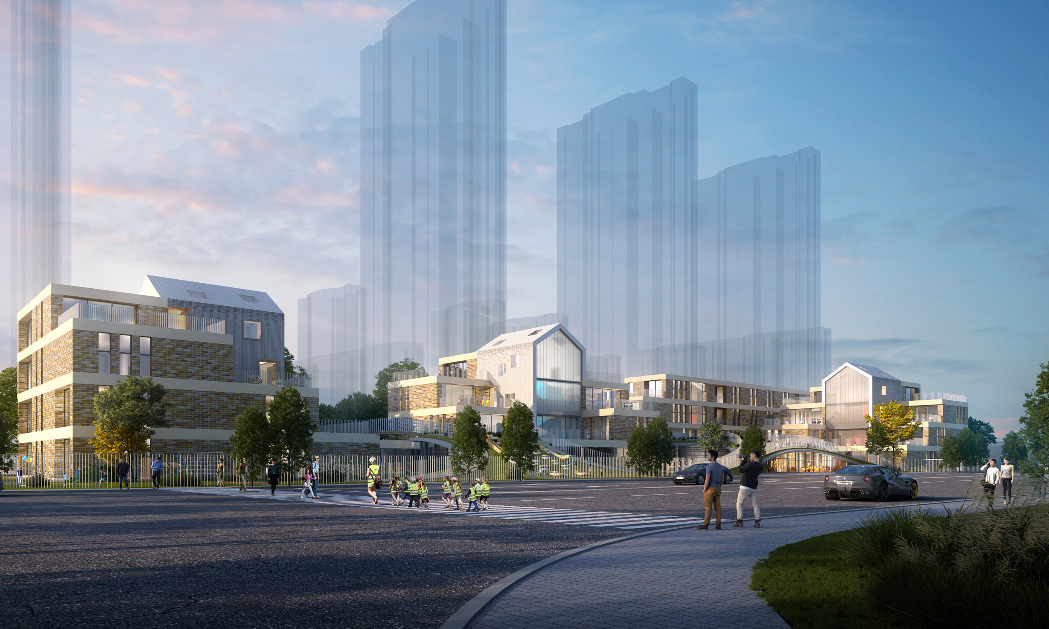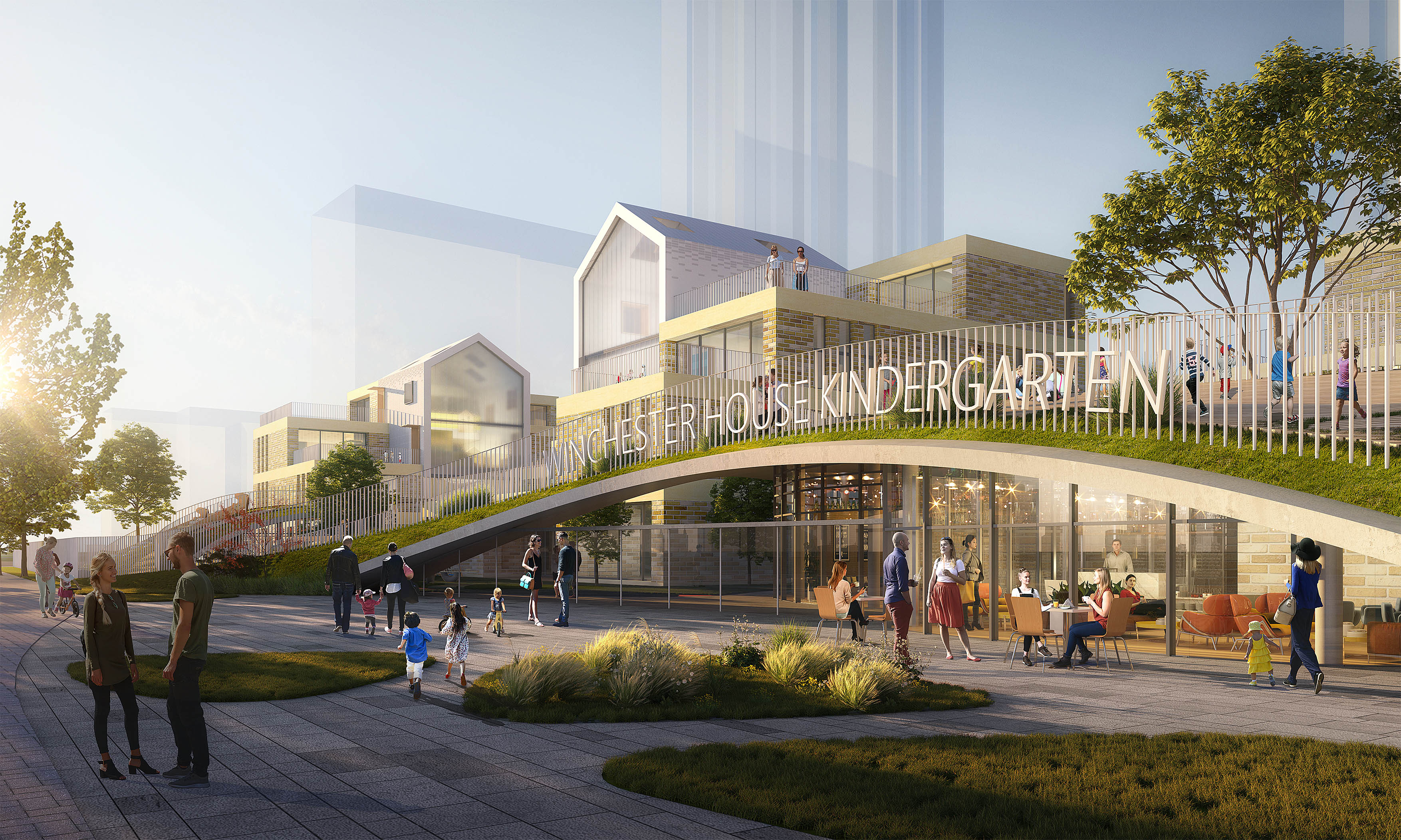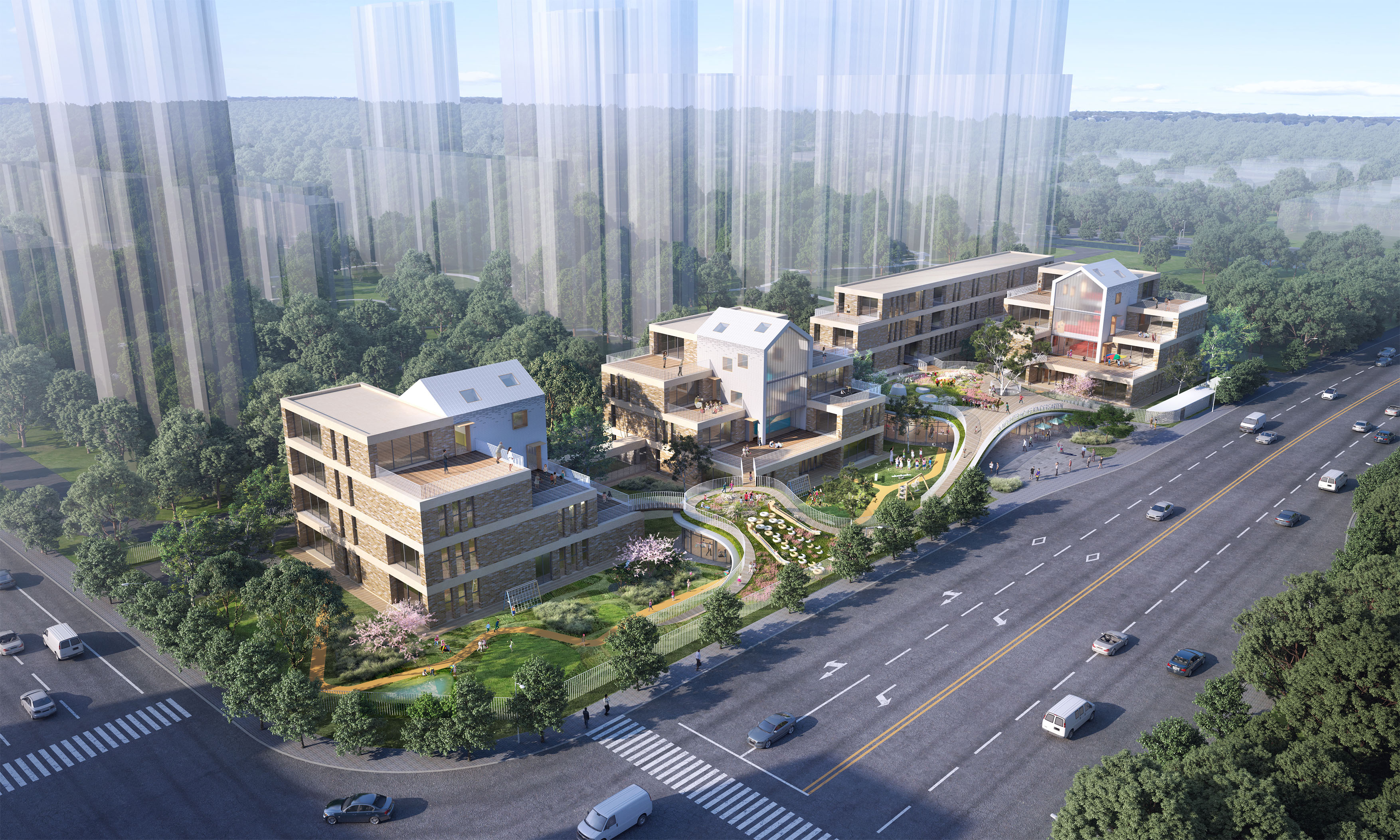 本案毗鄰醫(yī)院并被快速發(fā)展的居住區(qū)包圍,作為一家建筑面積近一萬平方米的特大型幼兒園,如何使空間助力每一個孩子的成長變成設計的難點。建筑師呼應幼兒空間需求,以“花園城堡”的理念設計將項目分成三組模塊,每組模塊中高低錯落的屋頂變成高層班級的戶外游樂場,符合幼兒空間尺度需求的公共場地增強幼兒安全感和歸屬感,同時分組式布置也減輕了校方的管理難度。