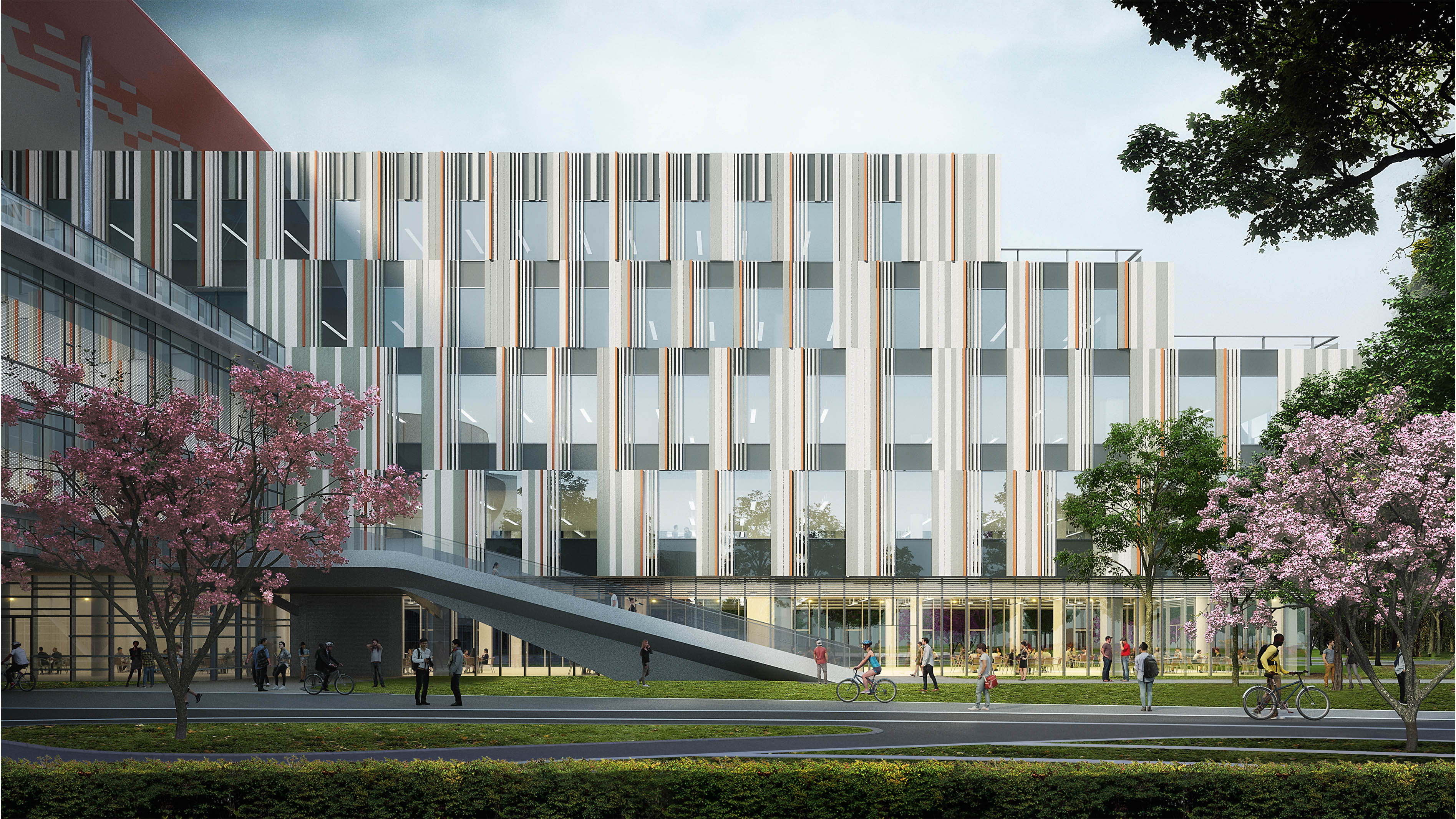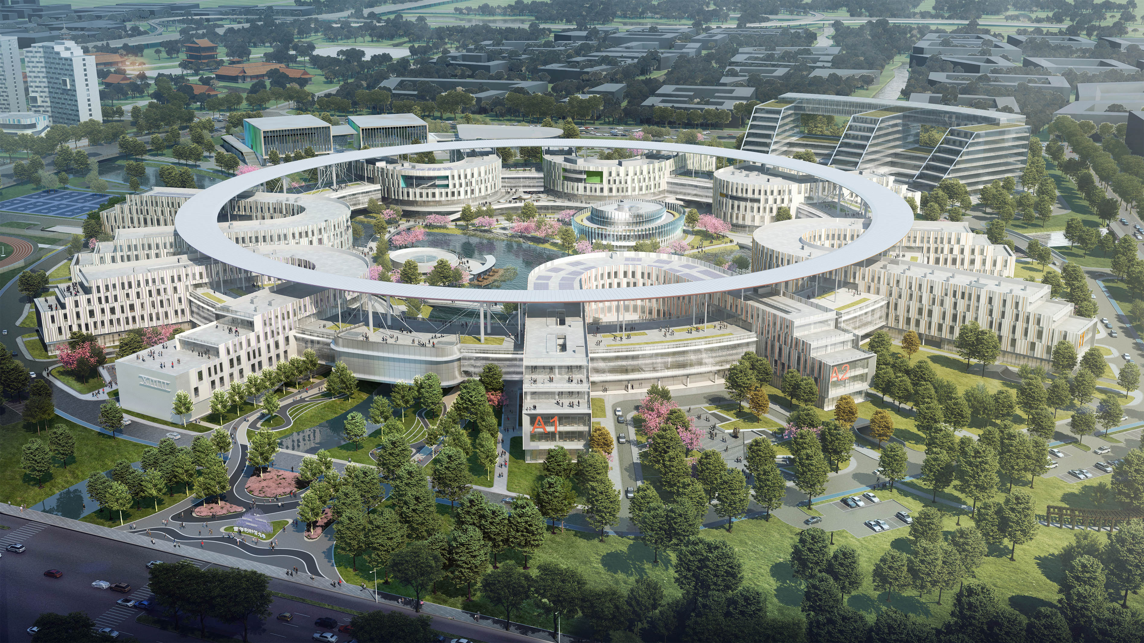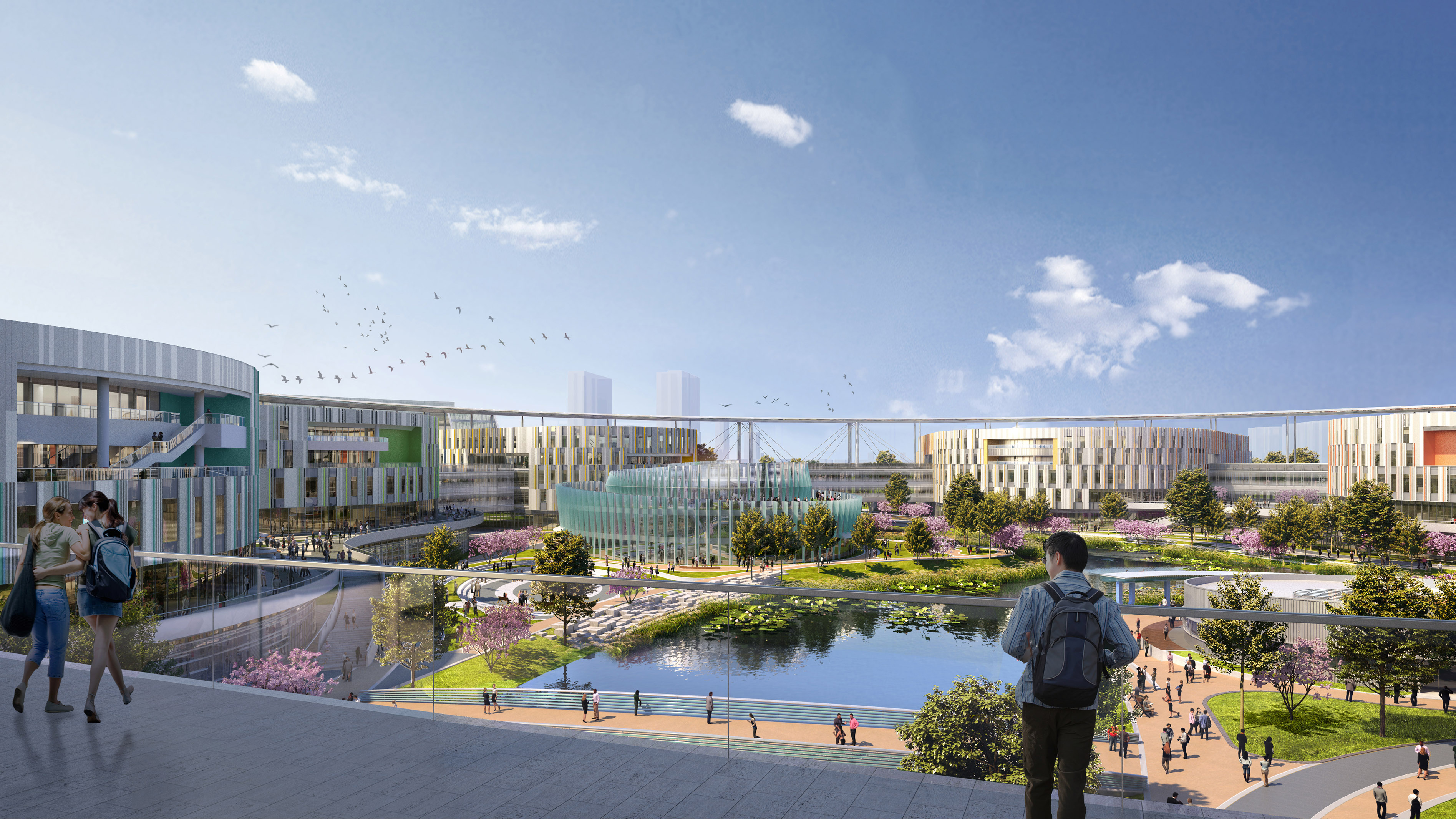 教學(xué)區(qū)主體由圓環(huán)形學(xué)習(xí)超市串聯(lián)7棟U形教學(xué)樓組成。圓環(huán)外部為車行交通,以及各樓的獨立出入口;圓環(huán)內(nèi)部以步行為主,打造舒適宜人的花園環(huán)境。在中央花園有學(xué)生活動中心與行政中心兩棟點狀建筑。Y 型河流從圓環(huán)中心穿過,將地面建筑、庭院以及地下室分為三個區(qū)域。